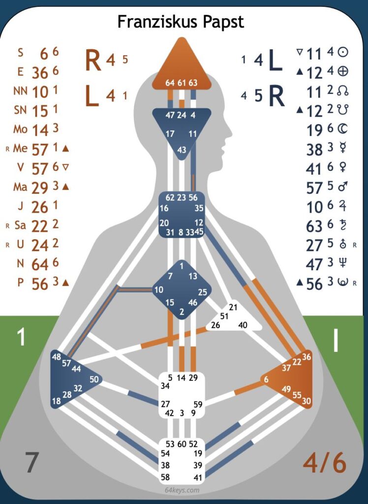 Im Human Design gibt es spezielle Kanäle und Tore, die bestimmte Energien betonen. Der Kanal 36-35, auch „Kanal der Transfusion“ genannt, könnte auf die Fähigkeit von Papst Franziskus hinweisen, Weisheit und spirituelle Einsichten zu teilen und gleichzeitig transformative Veränderungen in der Gesellschaft anzustoßen. Menschen mit diesem Kanal inspirieren oft andere durch ihre Überzeugungen und spirituellen Einblicke.
